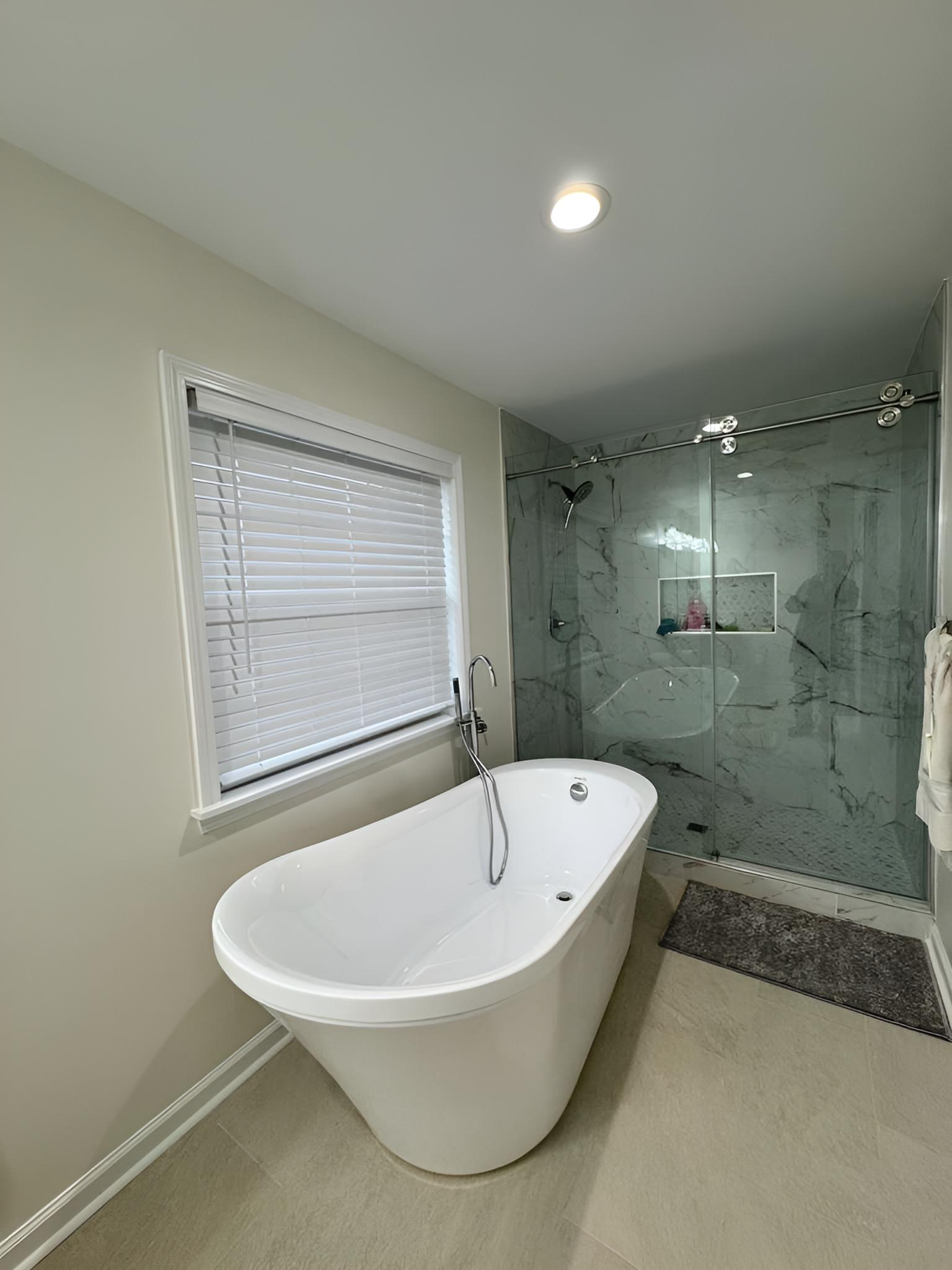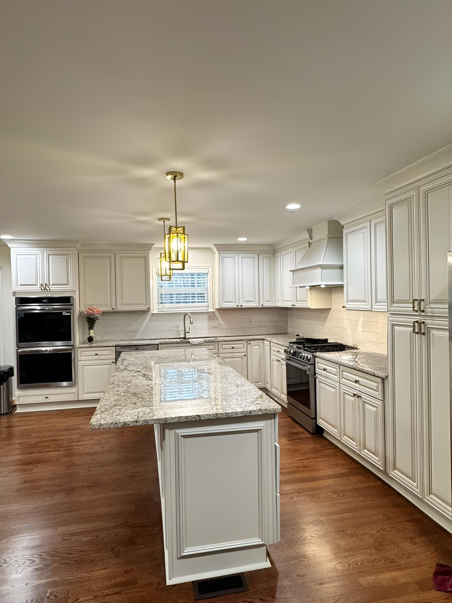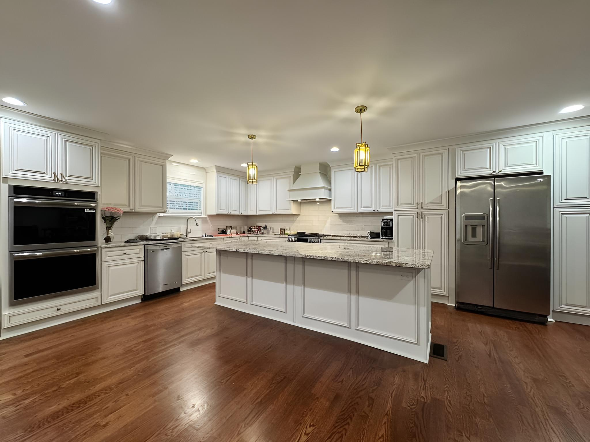 This full home renovation in Marietta by JMR Home delivers a modern and refined transformation across the basement, bedrooms, kitchen, and bathrooms. The open-concept kitchen features a central island, granite countertops, luxury finishes, and modern lighting, creating a seamless and elegant living space. Bathrooms were designed with premium materials, incorporating jacuzzi tubs, dedicated bathing areas, and sleek glass enclosures for a spa-like experience.