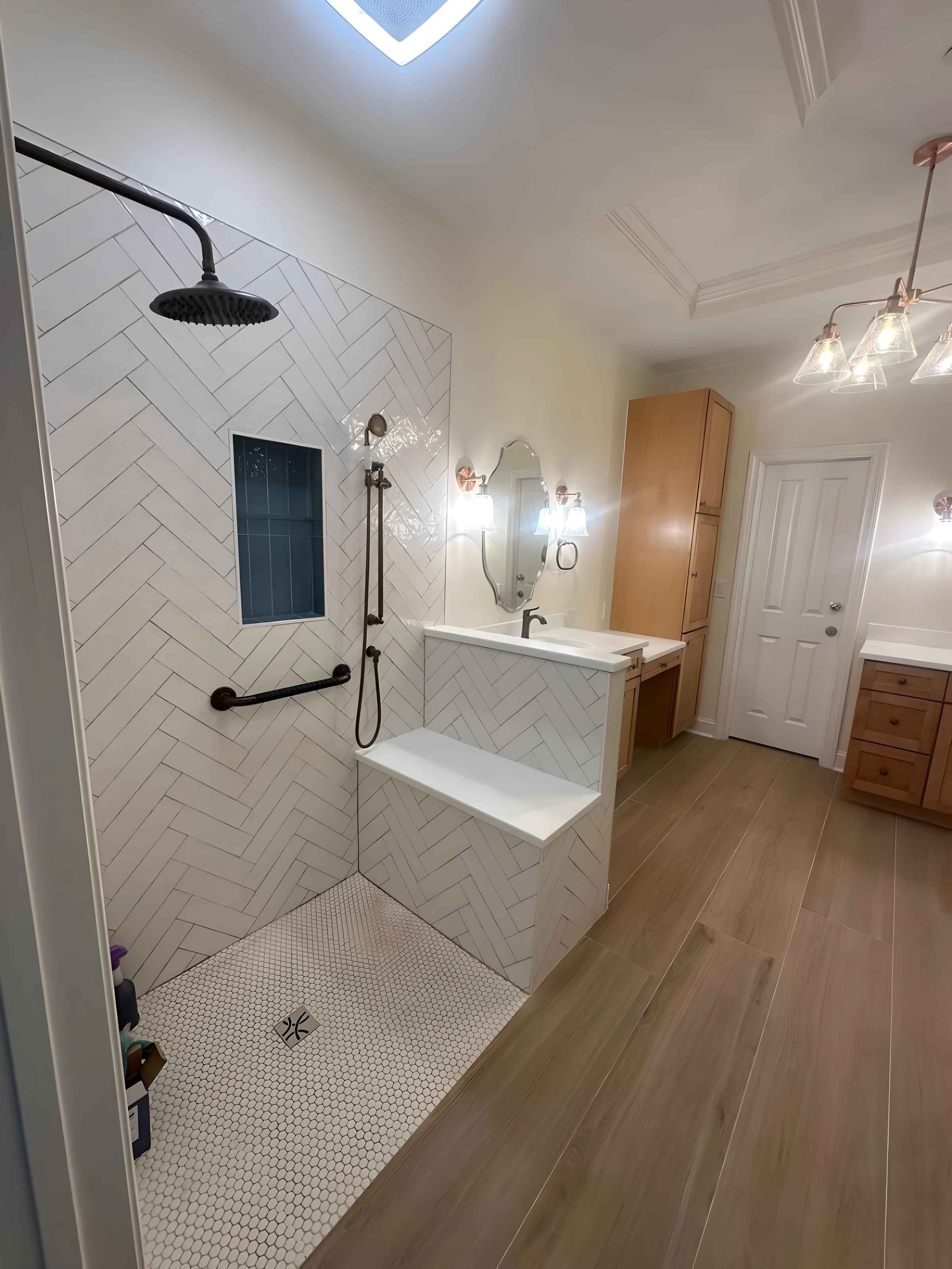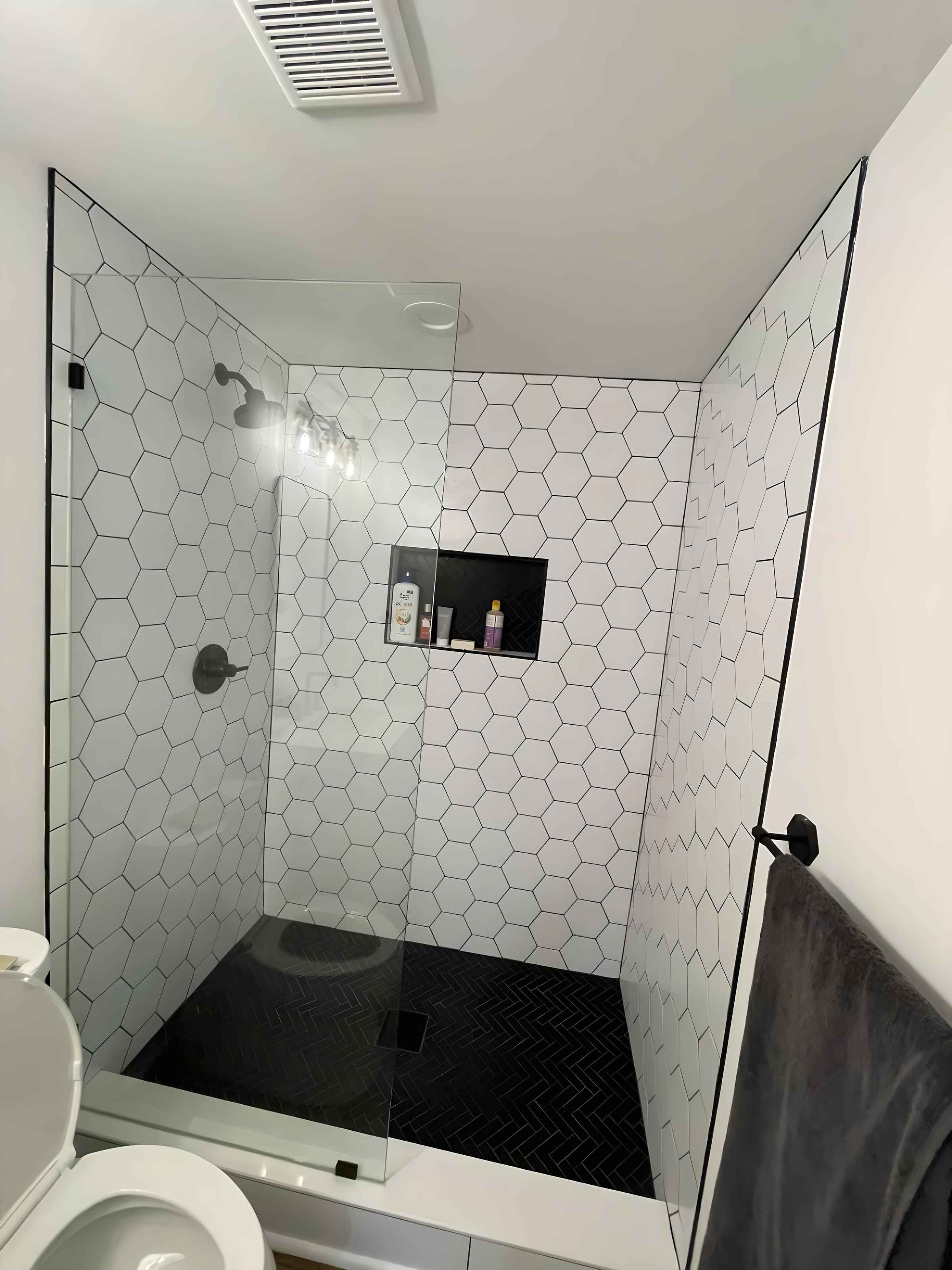 every shower is built with pre-sloped bases to prevent water accumulation and potential leaks. We then apply waterproof liners and a redguard membrane for complete protection.