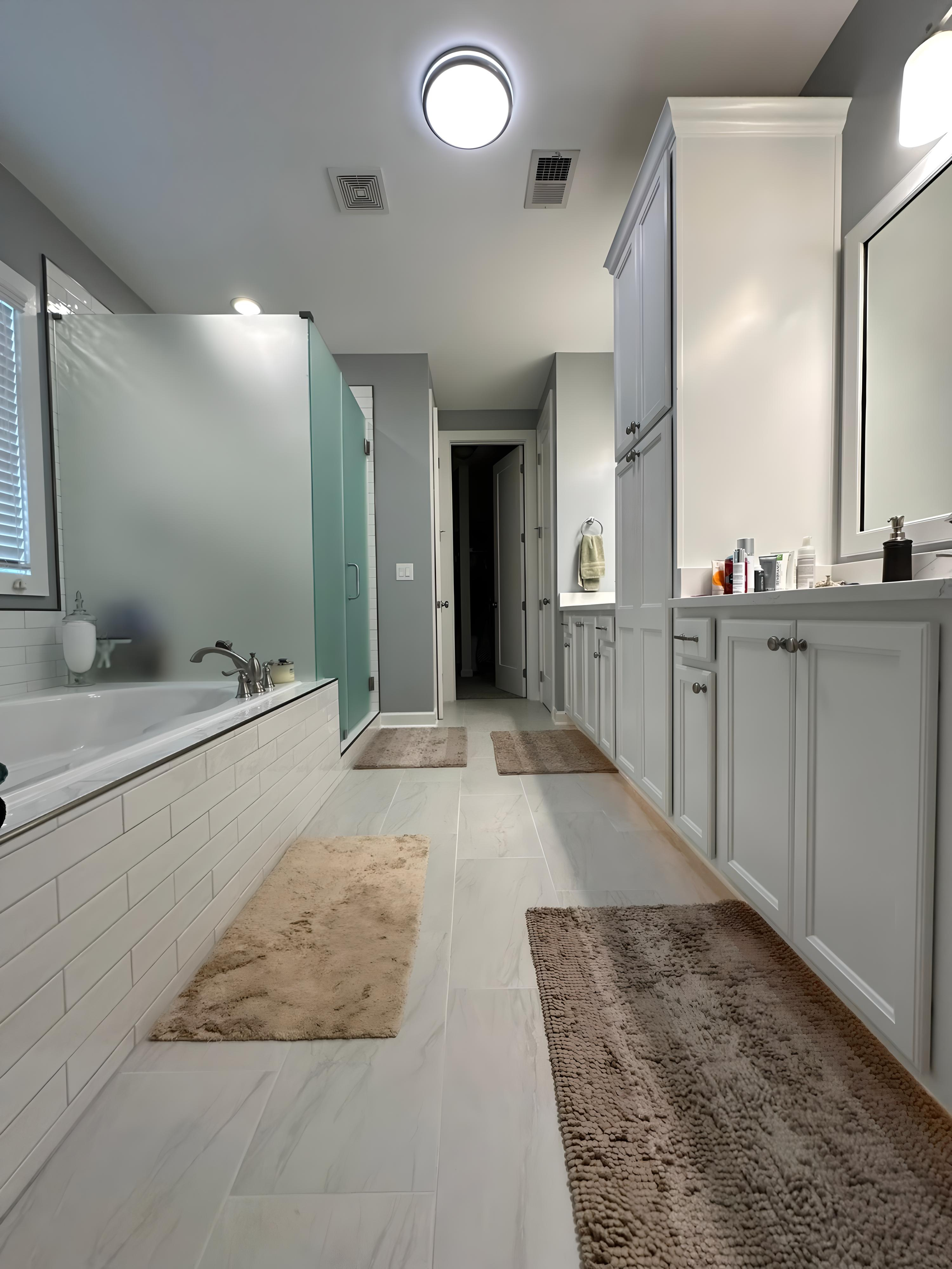 The renovation transformed the bathroom into an elegant, serene personal sanctuary.