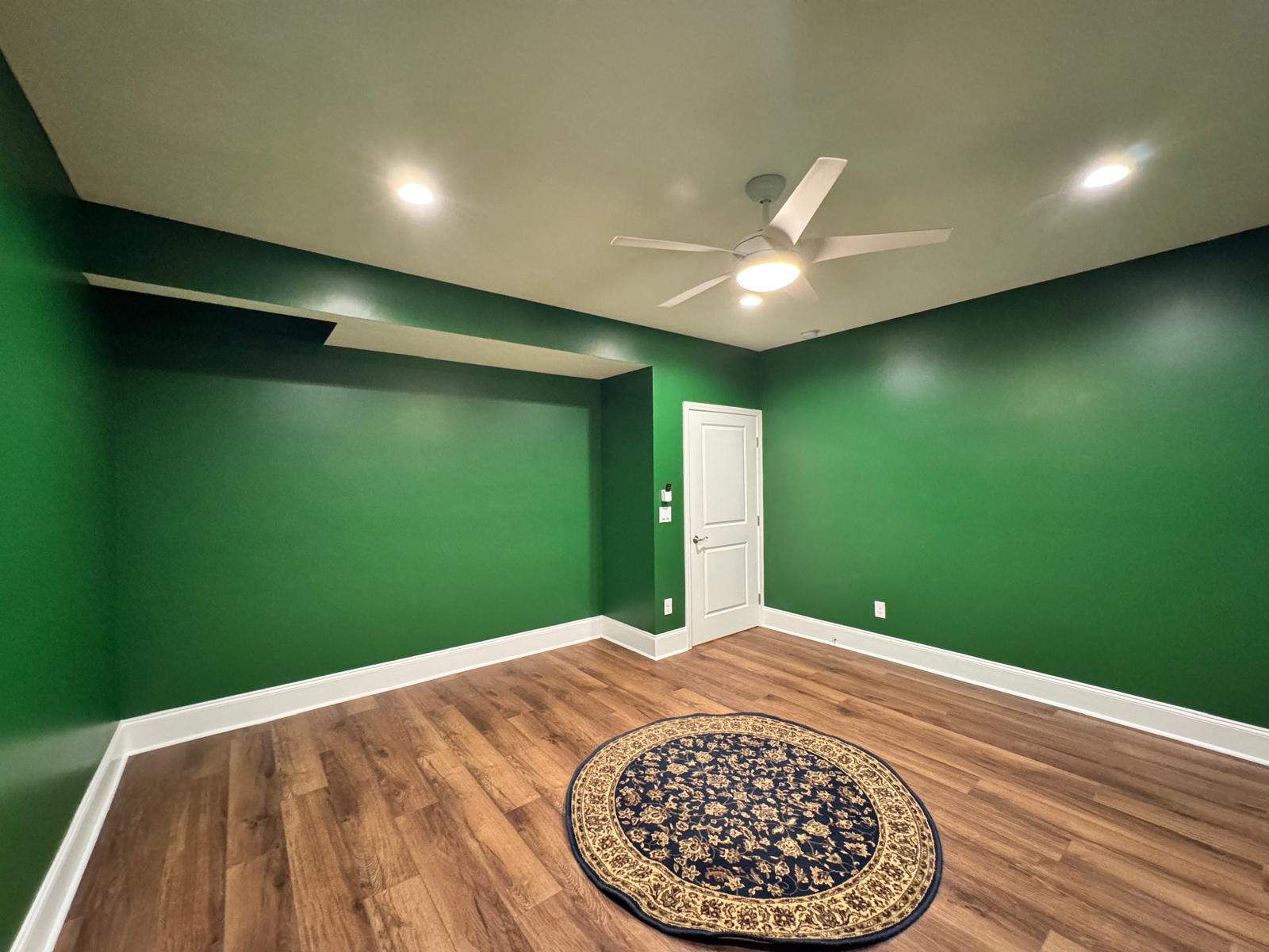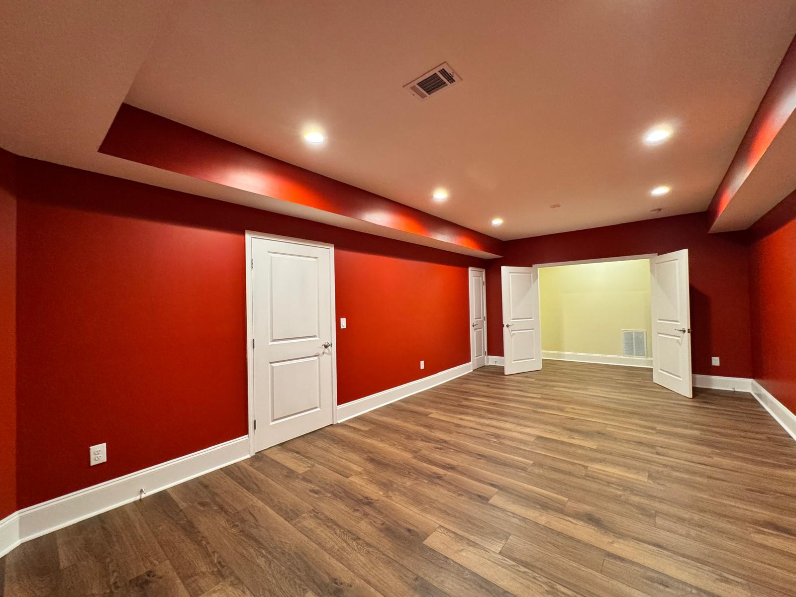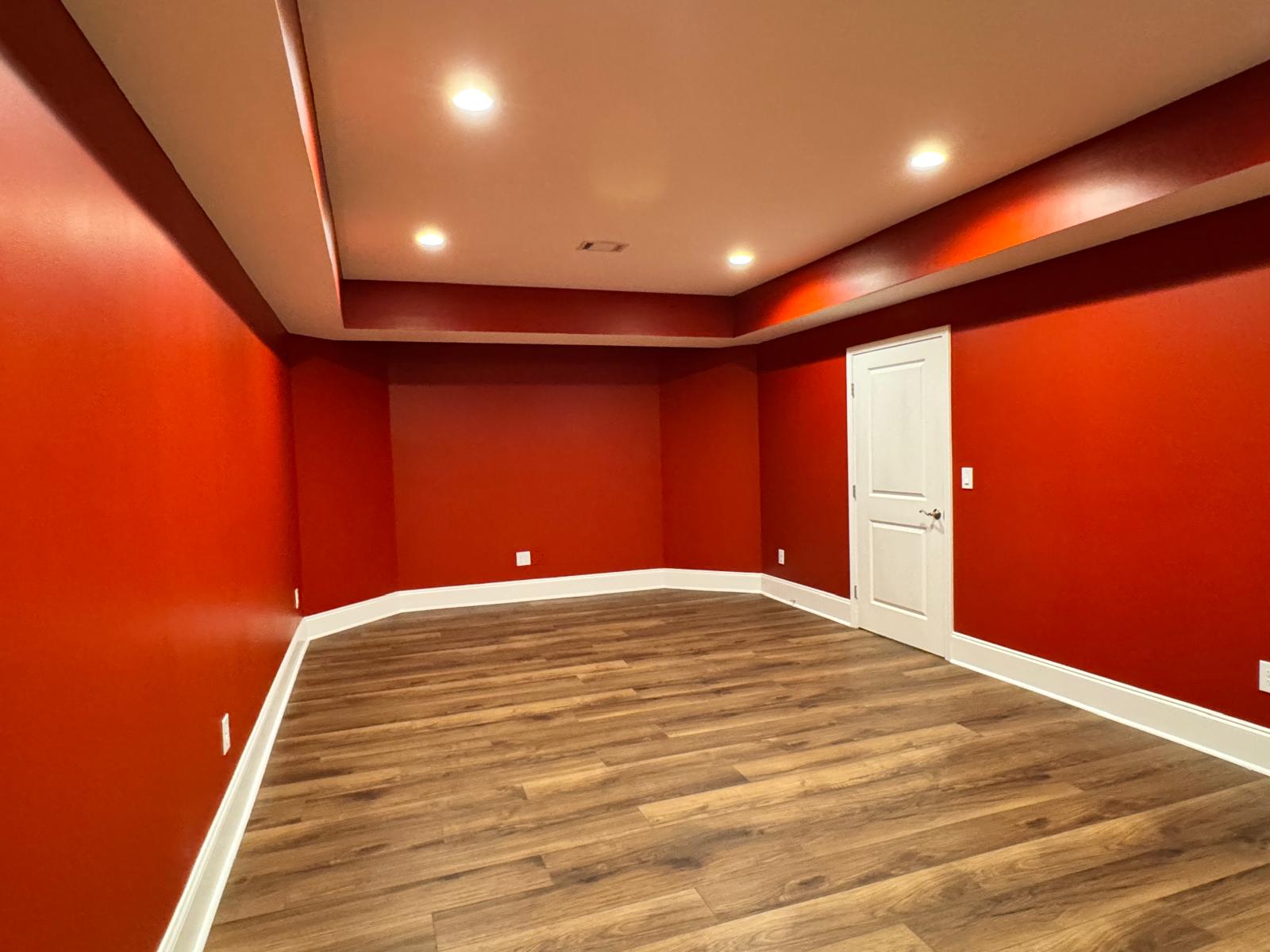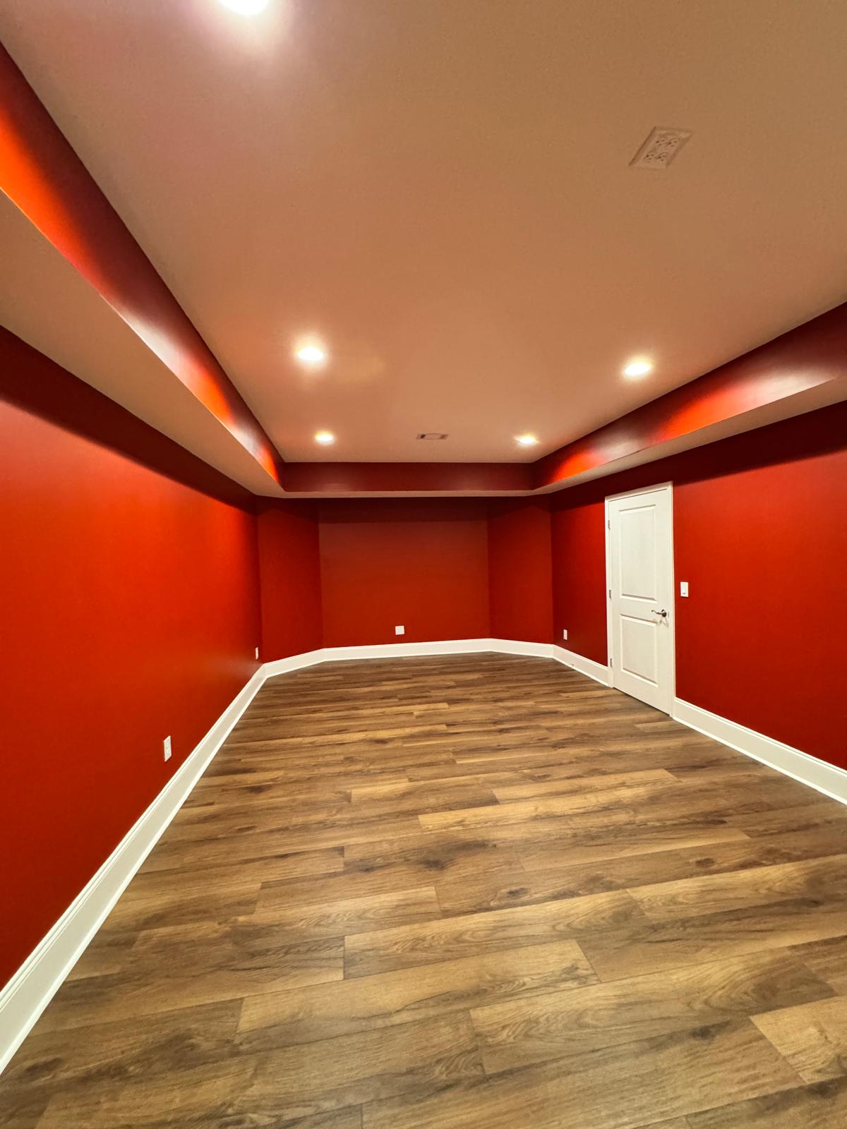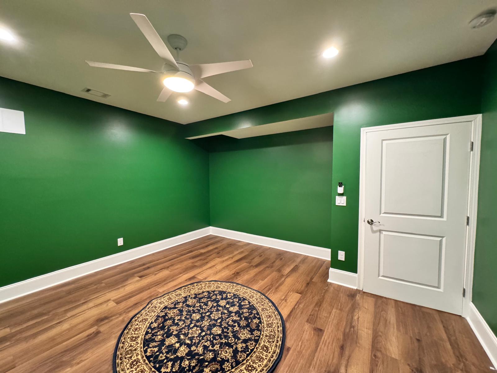 This project involved a full transformation tailored to the client’s vision. Laminated wood flooring was installed to add warmth and durability, while bold color choices in different areas—such as red and green—highlight a strong and confident personality. The space was ultimately converted into a custom relaxation area, perfectly aligned with the client’s lifestyle and personal requirements.